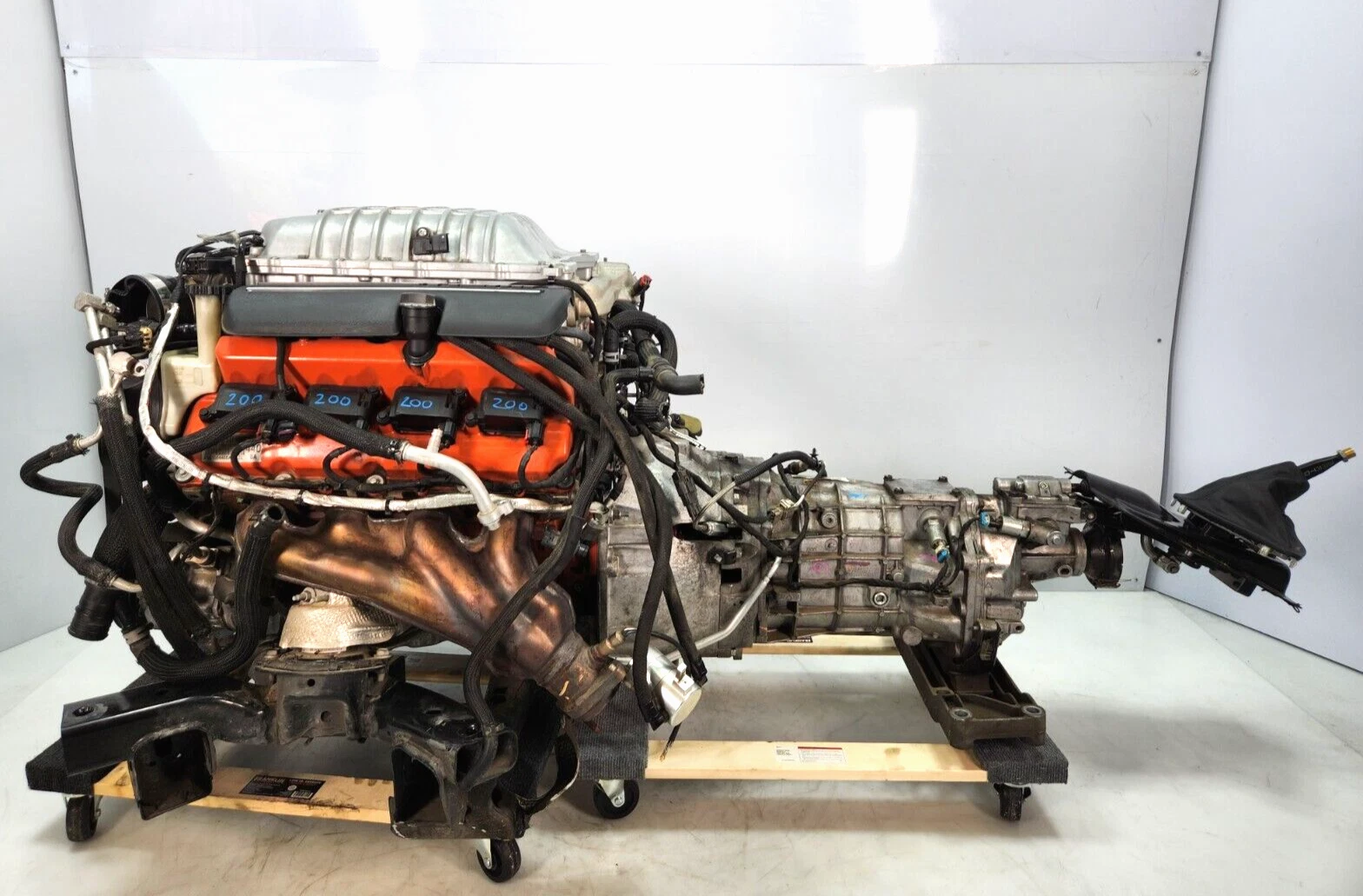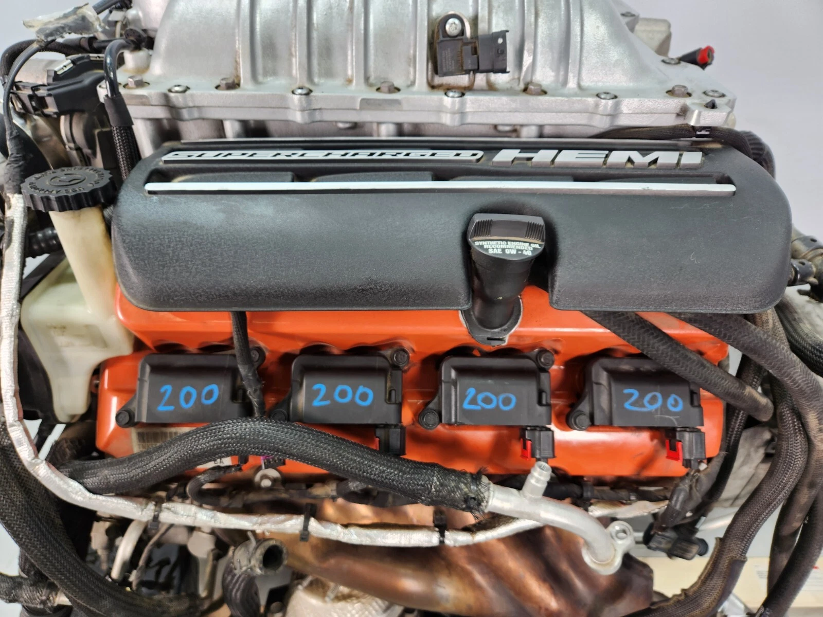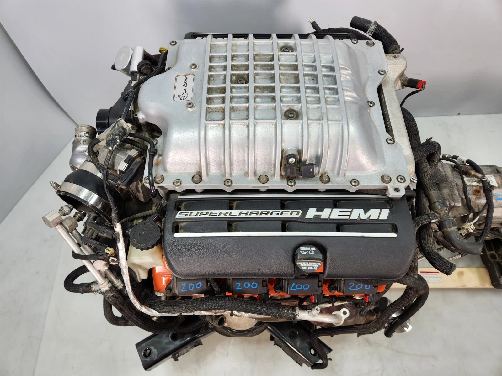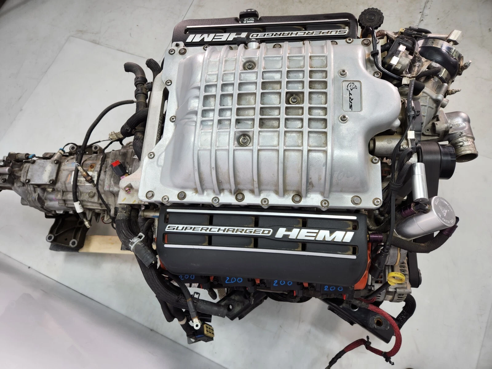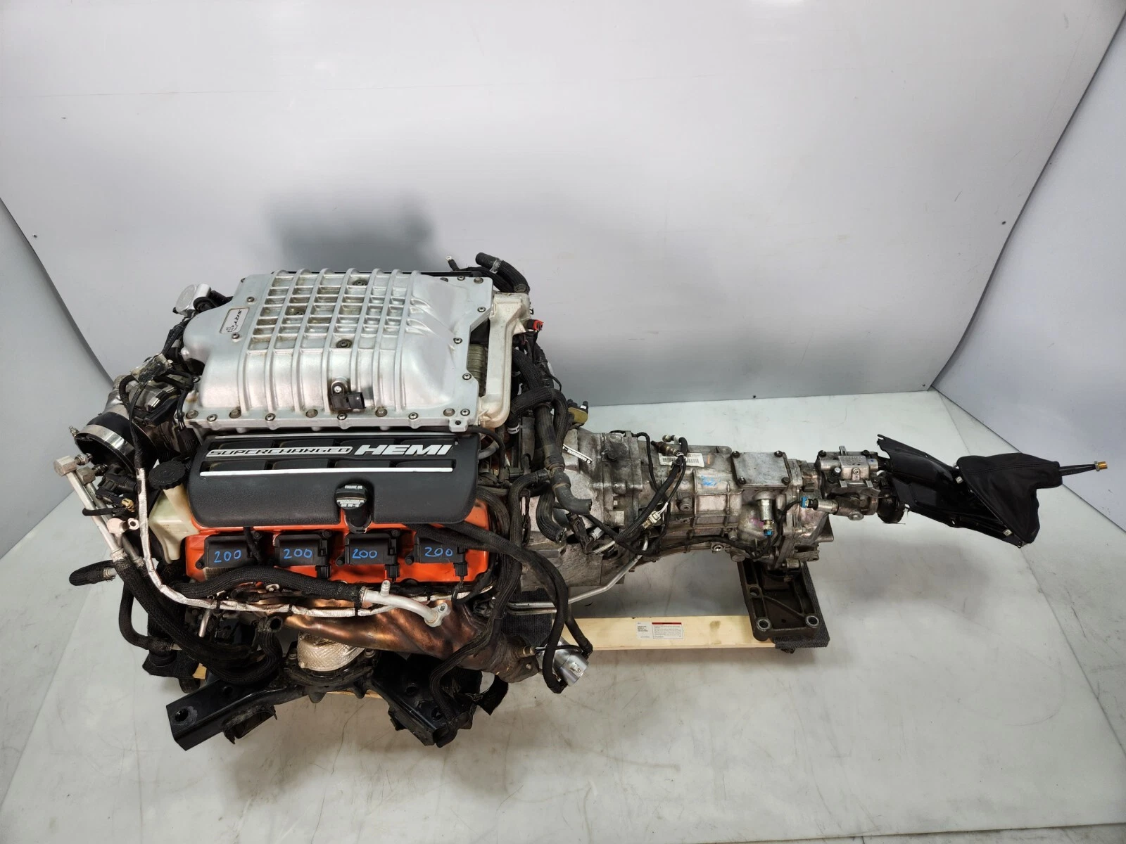 This is a used engine + transmission “drop-out” (meaning it was removed together) from a 2016 Challenger.  The engine is a 6.2 L supercharged “Hellcat” HEMI V8.